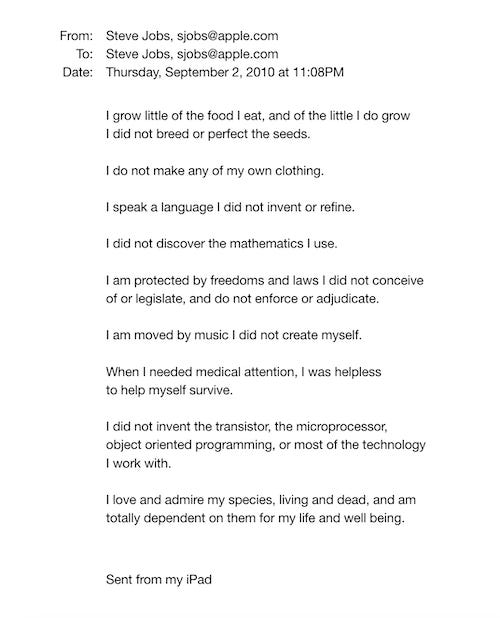 → I came across this email Steve Jobs wrote to himself (and fascinating archive site) earlier this week and can’t stop thinking about it. It demonstrates how dabbling in a lot of creative endeavors not only expands our own creative openness, but also increases our appreciation for our community, our species and the world writ large. It gives us access to something called Interconnectedness: the capacity to recognize both how integral we are as individuals, but how very small our place in the world can be. This is Creative Health in a nutshell. And, just like Steve said: It’s also our job to put something worthwhile back. What will your contribution be? 🧠