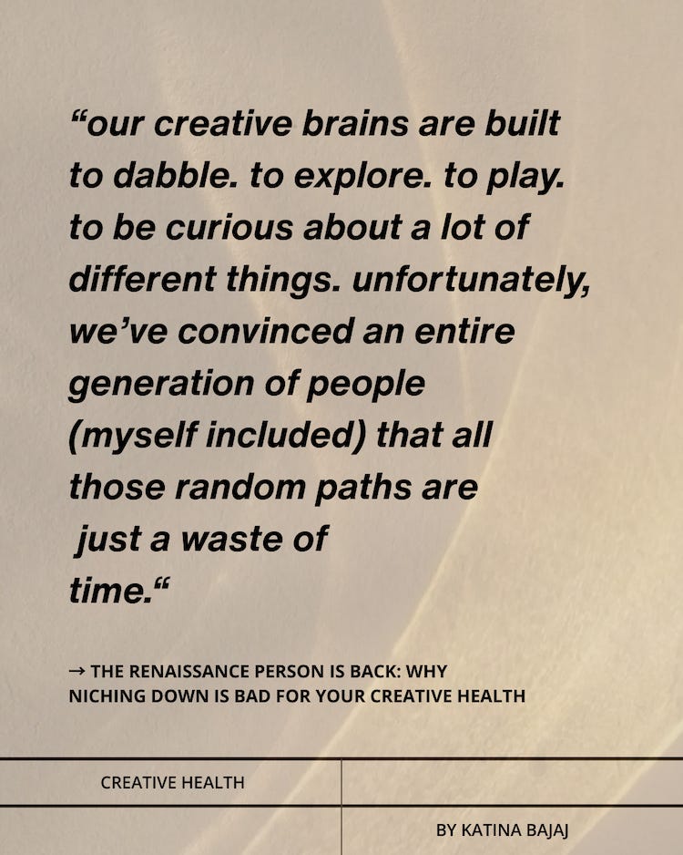This approach to life is not only essential for our creative “success” and the longevity of our Creative Health – but it’s also a small form of pushback against a system that flattens us. That tells us we are only capable of being one dimensional.